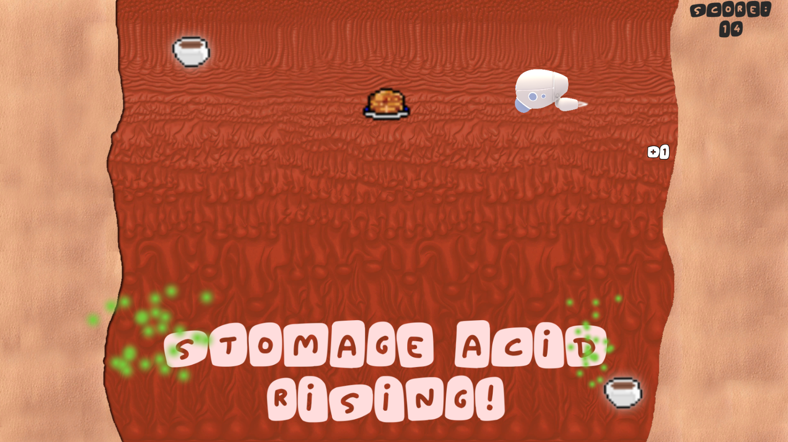 The player’s goal is to collect all the food in order to beat his own highscore and prevent the stomach acid from rising.